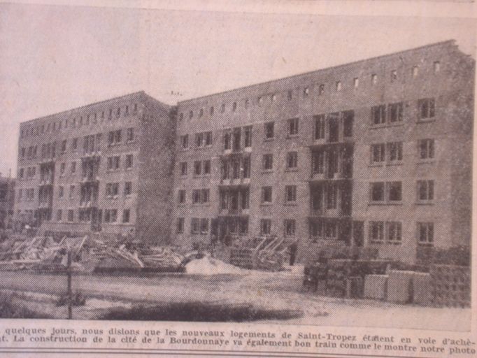 Réalisation de 128 logements HLM. Projet de Yves Guillou, photo de presse, sans date, 1953-1954. AD Morbihan 110 J 4033.Immatriculation