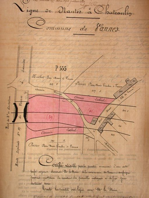 Voie ferrée. Plan des acquisitions dans la rue neuve et route de Pontivy. Propriété de Poirier, 1860. AD Morbihan S 1315.Immatriculation