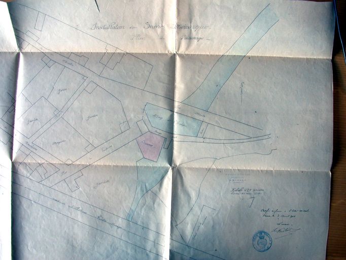 Entreprise Le Cloerec et Coutant au moulin de l'évêque. Etablissement d'une scierie mécanique, plan par Edmond Gemain. 1911. AD Morbihan 5M 232.Immatriculation