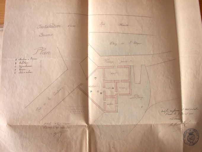 Entreprise Le Cloerec et Coutant au moulin de l'évêque. Etablissement d'une scierie mécanique, plan par Edmond Gemain. 1911. AD Morbihan 5M 232.Immatriculation