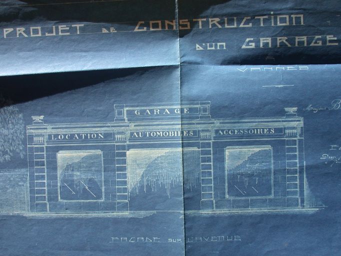 Elévation du garage par E. Gemain, 192?. AD Morbihan 5 M 230.Immatriculation