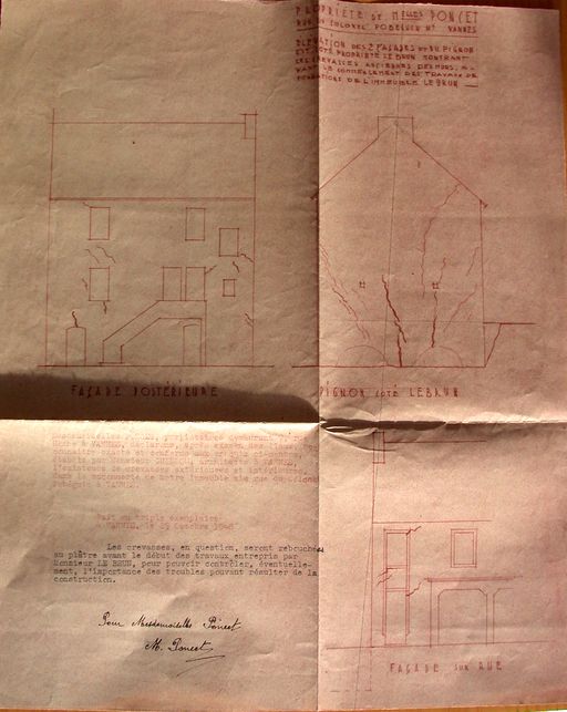 Elévation des 2 façades et du pignon est côté propriété Le Brun de la maison (act. détruit) des demoiselles Poncet (7 rue Hoche), 1948. AD Morbihan 110 J 4483.Immatriculation