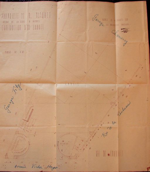Plan du garage Marquet (annoté garage Fily et Chameroy-Garnier) par Bardet et Lamourec, juillet 1932. AD Morbihan 5 M 230 garages.Immatriculation
