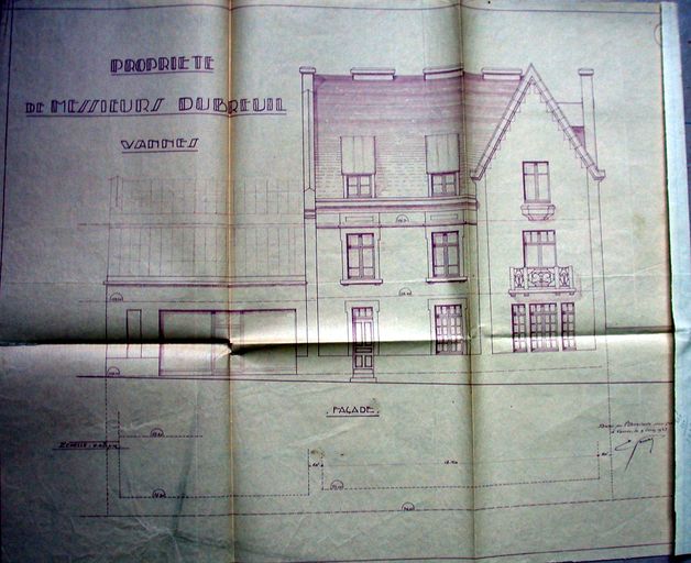 Elévation antérieure, par Gemain, 9 juin 1932. AM Vannes 5 I 162.Immatriculation