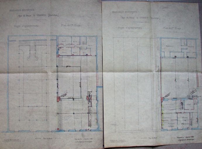 Projet d'agrandissement par Joseph Caubert de Cléry, janvier 1920 : plans du 1er et 2ème étages. AM Vannes 5 I 162.Immatriculation