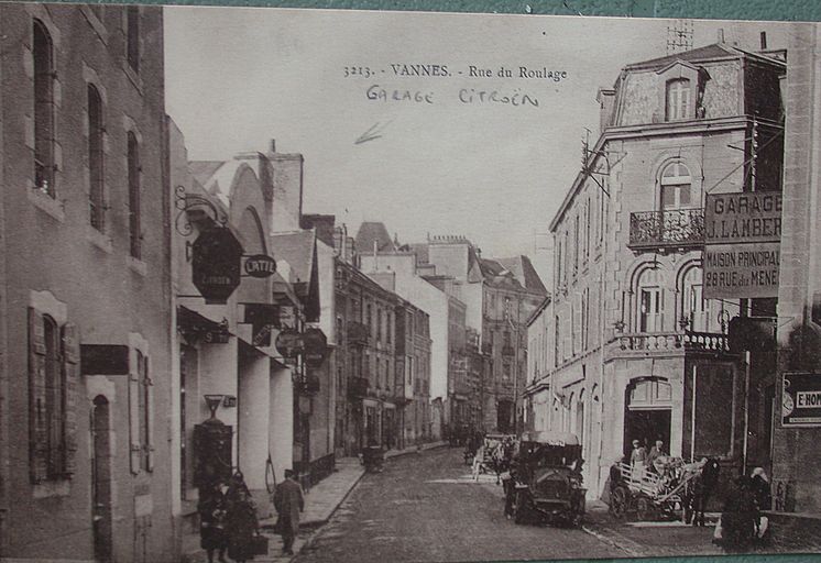 Partie est de la rue du Roulage, vue prise de l'est. Carte postale ancienne, vers 1930. AM, Vannes 7Fi.Immatriculation