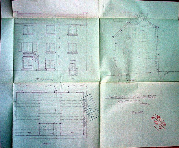 Plan au sol, élévation et coupe de la maison Le Grumelec. AM Vannes 1G59.Immatriculation