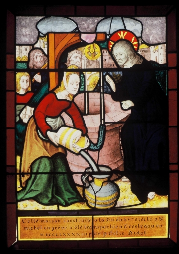 Détail du vitrail (remploi) situé sur le repos de l'escalier menant du rez-de-chaussée à l'étageImmatriculation
