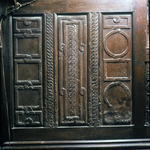 Détail de panneaux sculptés ornant la cage d'escalier menant du rez-de-chaussée à l'étageImmatriculation