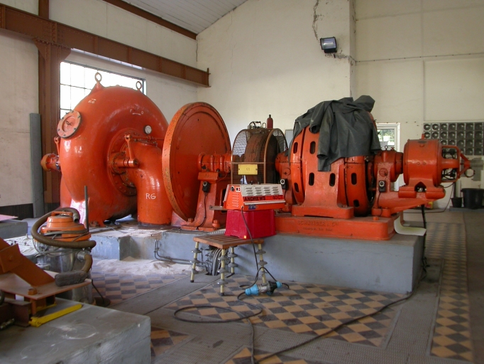 Vue générale de l'alternateur Schneider couplé à la turbine Francis double (à gauche).Immatriculation