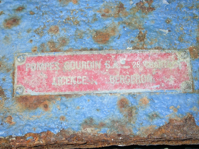Plaque de constructeur de la première pompe, détail : Pompes Gourdin SA - 28 Chartres - licence Bergeron.Immatriculation