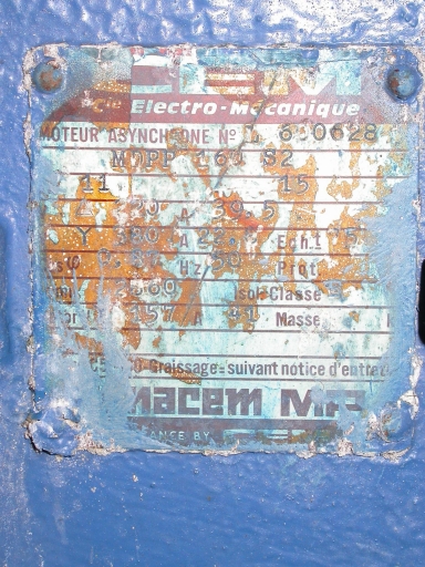 Plaque de constucteur d'un des deux moteurs électriques : Compagnie Electro-Mécanique (CEM).Immatriculation