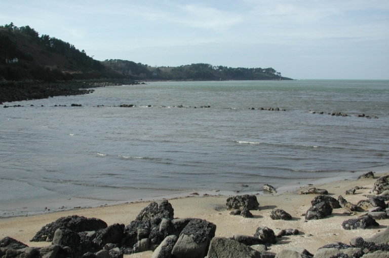 Vue générale l'anse de la Vierge à marée montante : la pêcherie est presque recouverteImmatriculation