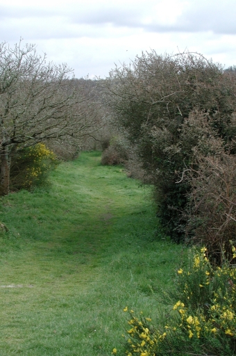 Chemin bordé de buissons d'aubépine et de genêts menant aux sites de la Pierre Branlante, des Rochers du Château et de Beaumanoir (site départemental)Immatriculation