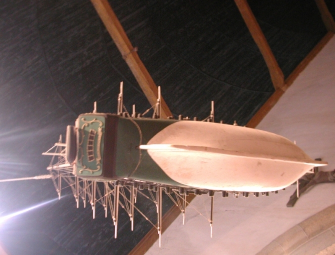 Vue générale en contre-plongée d'une maquette ex-voto suspendueImmatriculation