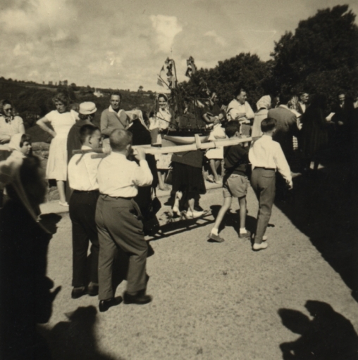 La procession poursuit son chemin avec les maquettes sur leur civièreImmatriculation
