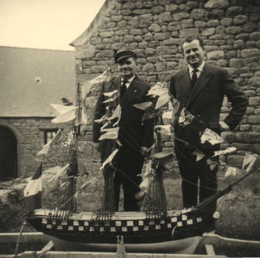 Le 20 mai 1962, François et Théo Le Pierres devant la maquette de procession du trois-mâtsImmatriculation