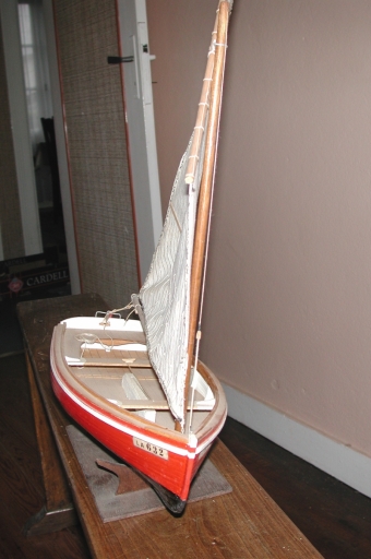 Vue de l'avant : maquette de dériveur du type Denise réalisée par Pierre BonnyImmatriculation