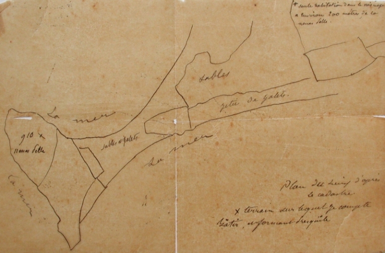 Plan de situation de la future friterie et salaison de Loquémeau au lieu dit Ar Nenesdelle par Huon de Penanster, parcelle n° 910, 1879 (AD 22)Immatriculation