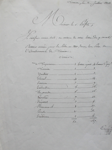 Tableau nominatif des bateaux de pêche de l'arrondissement de Lannion en 1810 : 50 bateauxImmatriculation