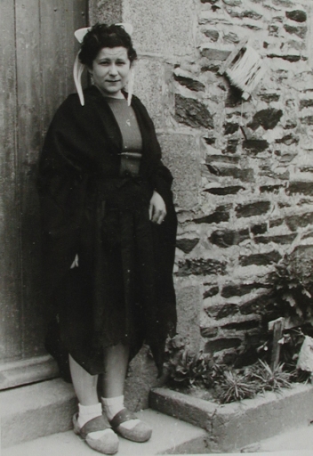 Madame Levier avec sa coiffe du Trégor, devant la maison familiale près de l' école publiqueImmatriculation