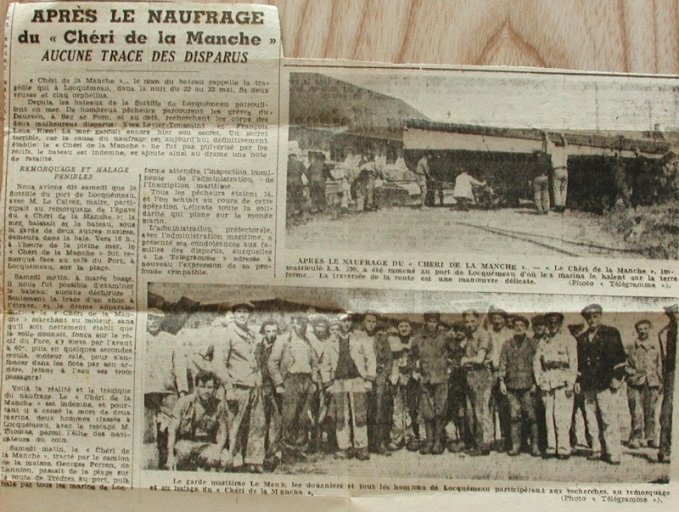 Article du journal Le Télégramme sur le naufrage du Chéri de la Manche le 22-23 mai 1952 : Toussaint Levier François Lous portés disparusImmatriculation