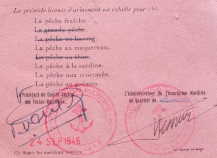 Licence professionnelle d'armement à la pêche de Georges-Auguste Levier pour le bateau Hoas Halec LA 828 en 1946 (verso)Immatriculation
