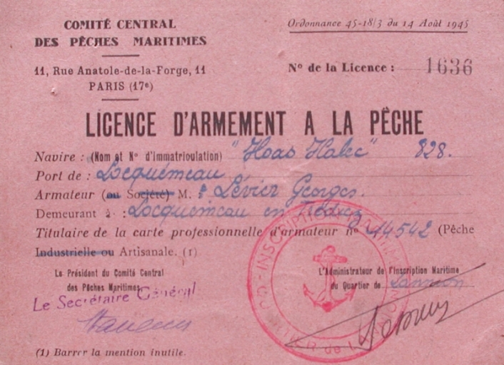 Licence professionnelle d'armement à la pêche artisanale n° 1636 de Georges-Auguste Levier pour le bateau Hoas Halec LA 828 en 1946 (recto)Immatriculation