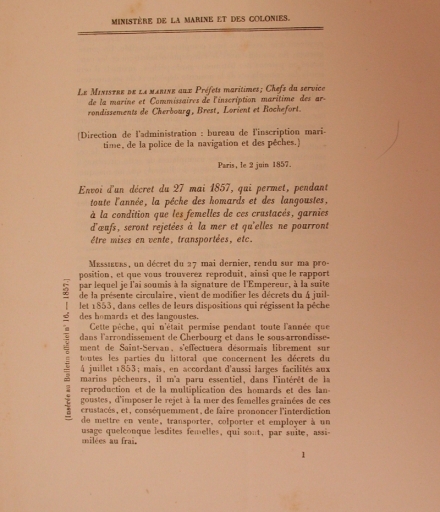 Extrait du décret de 1857 réglementant la pêche aux grands crustacés (homards)Immatriculation