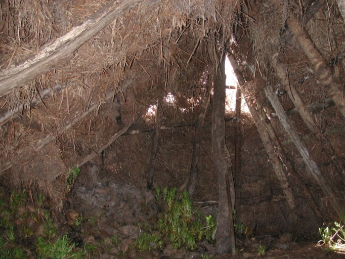 Trois perches en châtaignier permettent d'étayer l'ensemble de la constructionImmatriculation