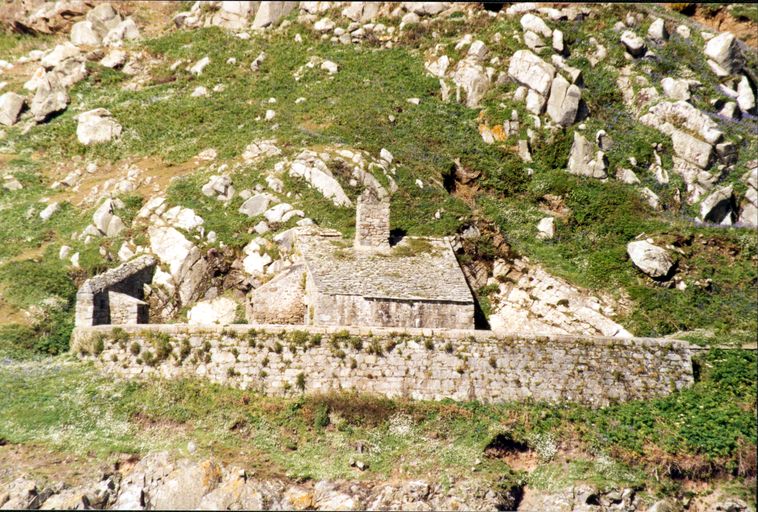 Perros-Guirec, fort de l'île aux Moines : vue de la grande batterie de Cosmoguer avec son corps de garde : noter que les constructions se confondent avec la falaiseImmatriculation