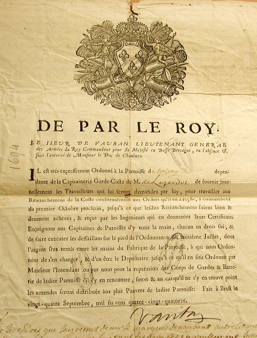 Ordonnance de Vauban relative à la fourniture de travailleurs de la paroisse de Trévény (Côtes-d'Armor) pour les retranchements et réparations des corps de garde et batteries de côte, fait à Brest le 24 septembre 1694Immatriculation