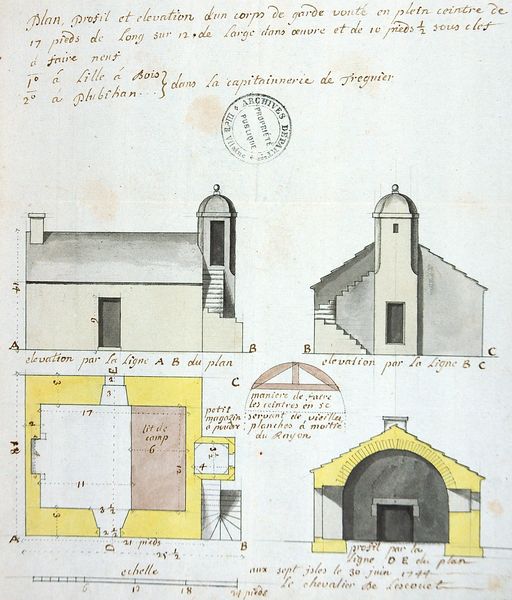 Plan, profil et élévation d'un corps de garde voûté en plein cintre destiné à l'île à Bois et à Pleubian, fait aux Sept-îles le 30 juin 1744 par le chevalier de LescouëtImmatriculation