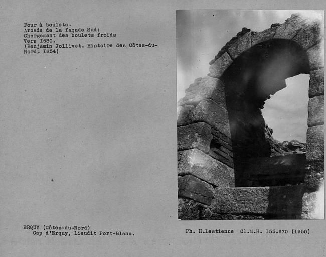 Vue du four à boulets d'Erquy : détail de l'orifice d'entrée des boulets, 1950Immatriculation