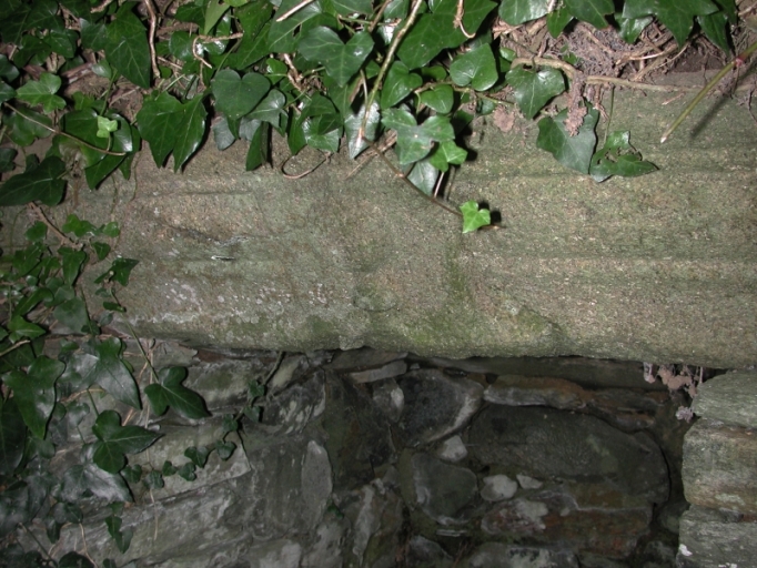 Fronton en granite de la fontaine de Kergadiou avec calice sculpté au milieuImmatriculation