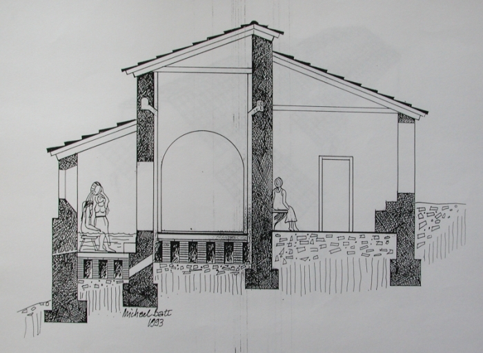 Dessin : coupe de l'hypocauste du Hogolo (Matt May Michaël, 1993).Immatriculation