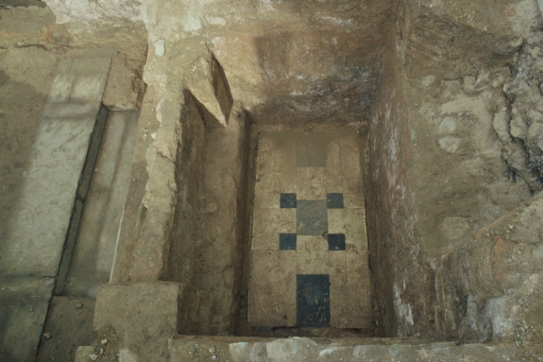 Dégagement du bain froid et découverte du parement avec ses motifs géométriques (calcaire et schiste noir et vert)Immatriculation