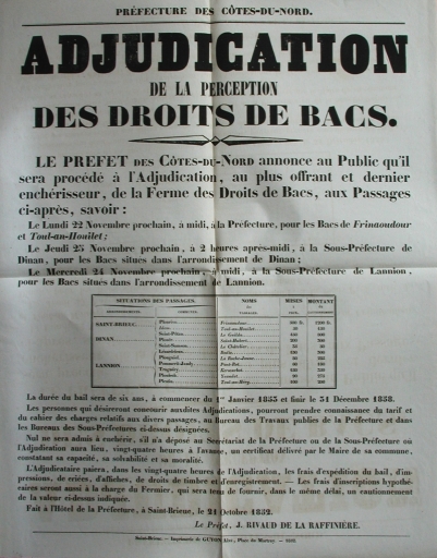 Adjudication des droits de bacs pour Lannion,1853-1858 (AD 22)Immatriculation