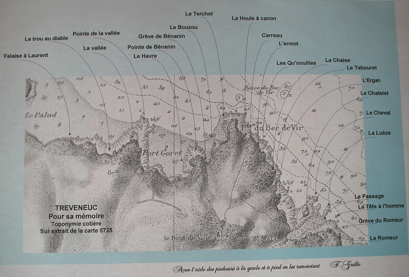 Situation de l'anse de Port Goret : toponymie côtière (carte 5725 du SHOM, annotée par F. Guillo, avec les l'aide des pêcheurs plaisanciers de TreveneucImmatriculation