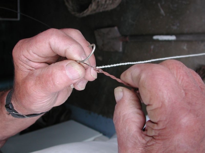L'art de nouer : Raymond Pays montre le noeud de grapin et le nœud de ligne (nœud plat), utilisés pour attacher un hameçonImmatriculation