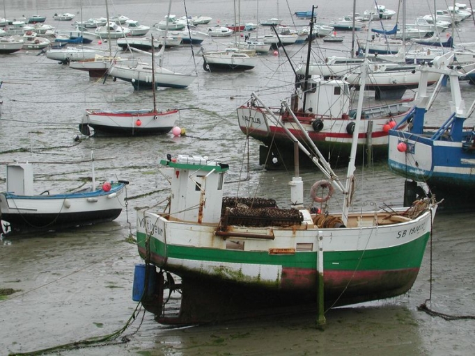 Coquillers à l'échouage dans l'ancien port d'Erquy (dragues posées sur la lisse)Immatriculation