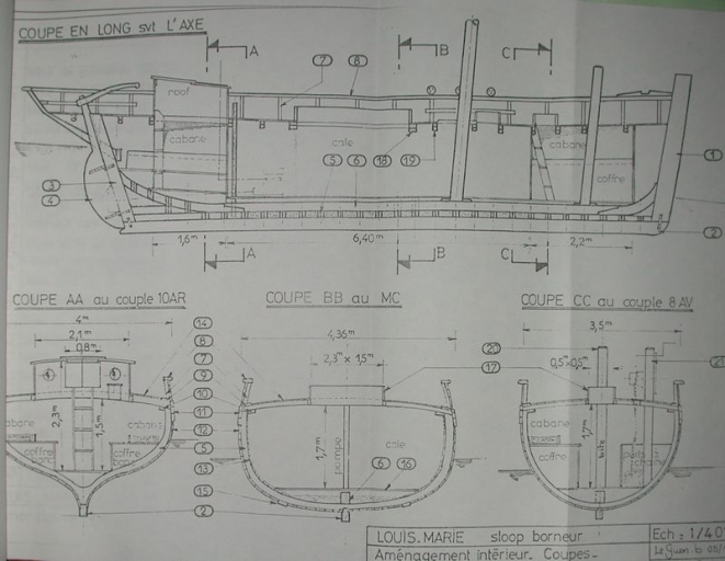 Plan en long du Louis-Marie au 1/40ème suivant l'axe et coupe, aménagements intérieurs (Jean Le Bot)Immatriculation