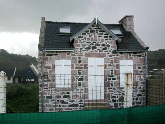 Maison datée de 1925, en schiste et grès, utilisée comme commodité par un pêcheur à pied (lignes de fond) : front de mer de Saint-PabuImmatriculation