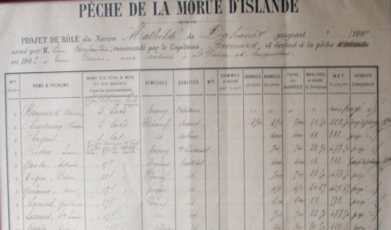 Le rôle d'équipage du trois mâts Mathilde pour la campagne de 1902 à Terre-Neuve et Saint-Pierre-et-MiquelonImmatriculation