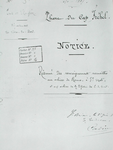 Notice du conducteur des Ponts et Chaussées Cadin : histoire technique du phare de Fréhel, 1887Immatriculation