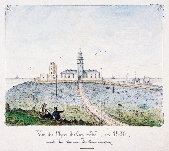 Dessin aquarellé : le phare et le sémaphore de Fréhel en 1880, avant les travaux de transformation, par le conducteur Cadin (AD 22)Immatriculation