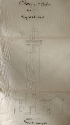 Plan sur calque : élévation et coupe du nouveau phare de 1er ordre par Léonce Reynaud, 1844 (AD 22)Immatriculation