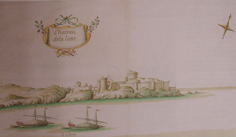 Dessin : galères dans la baie de la Fresnaye devant le château, milieu du 18ème siècle (SHAT, Génie)Immatriculation