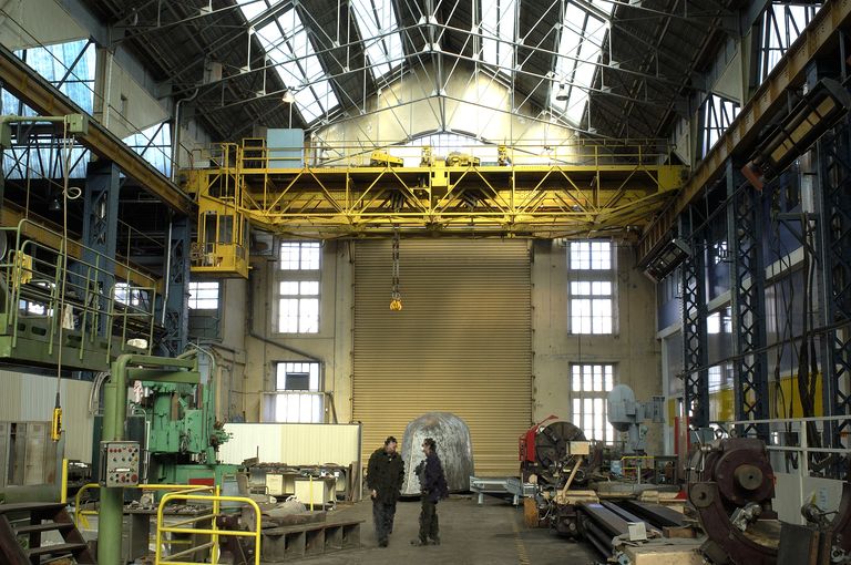 Vue de la halle d'usinage : un des nombreux ponts roulantsImmatriculation