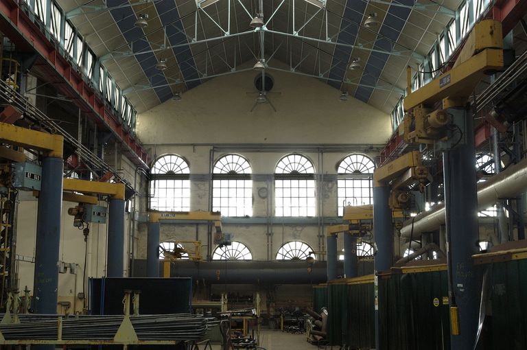Vue de la halle de la chaudronnerie, détail des baies vitrées en plein cintreImmatriculation